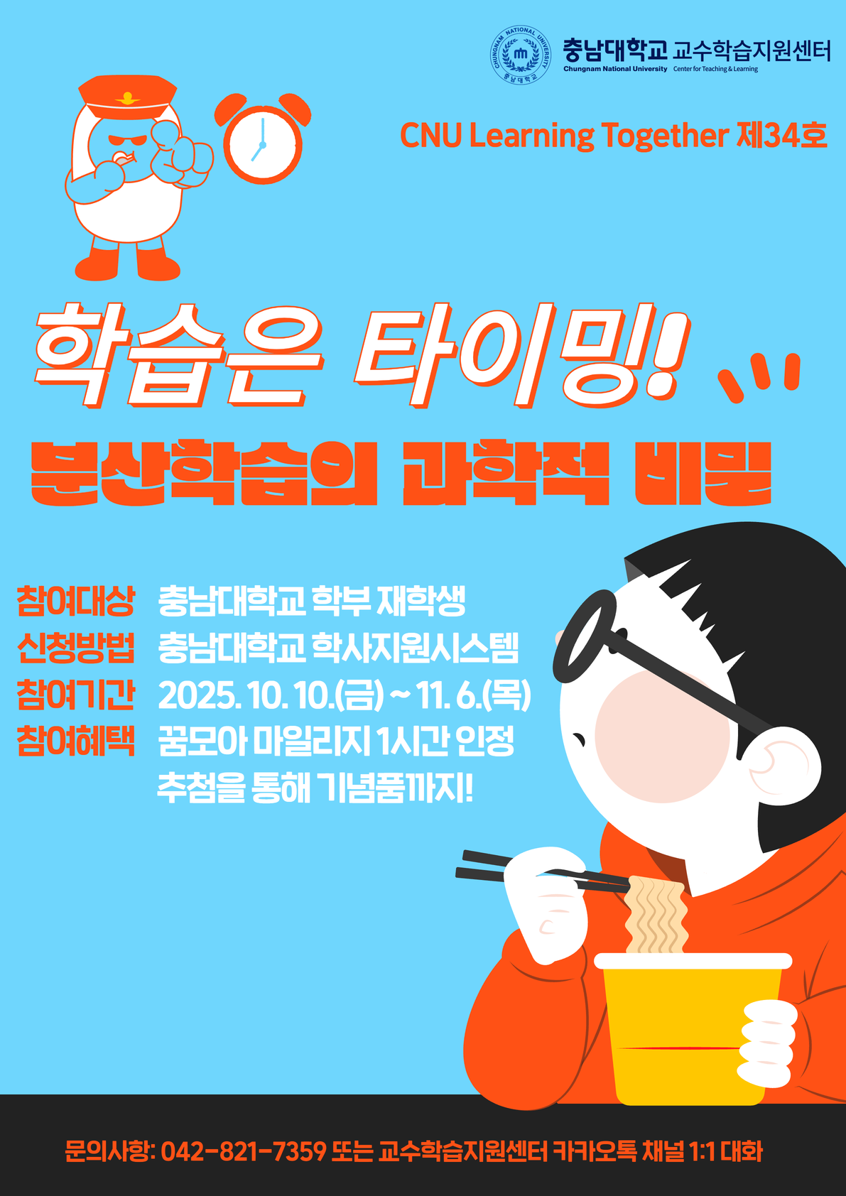 가. 주제: 학습은 타이밍! 분산학습의 과학적 비밀 나. 대상: 학부 재학생 다. 프로그램 신청 및 주요 내용 1) 프로그램 신청: 학사지원시스템(http://with.cnu.ac.kr)→로그인(CNU포털과 동일한 아이디/비밀번호)→비교과프로그램→개인비교과 신청→CNU Learning Together(34호)→신청 및 학습 자료 읽기→만족도 설문 참여 2) 신청 및 참여기간: 2025. 10. 10.(금) ~ 11. 6.(목) 3) 세부 내용: [붙임] 참고 라. 참여특전: 만족도 설문 참여 시 꿈모아 마일리지 1시간 실적으로 인정 |